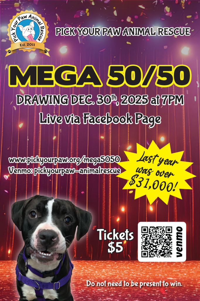 DO you have a business or know a business that like to sell our Mega 50/50??? Please reach out to us to discuss. 732-252-9686 or email raffle@pickyourpaw.org.